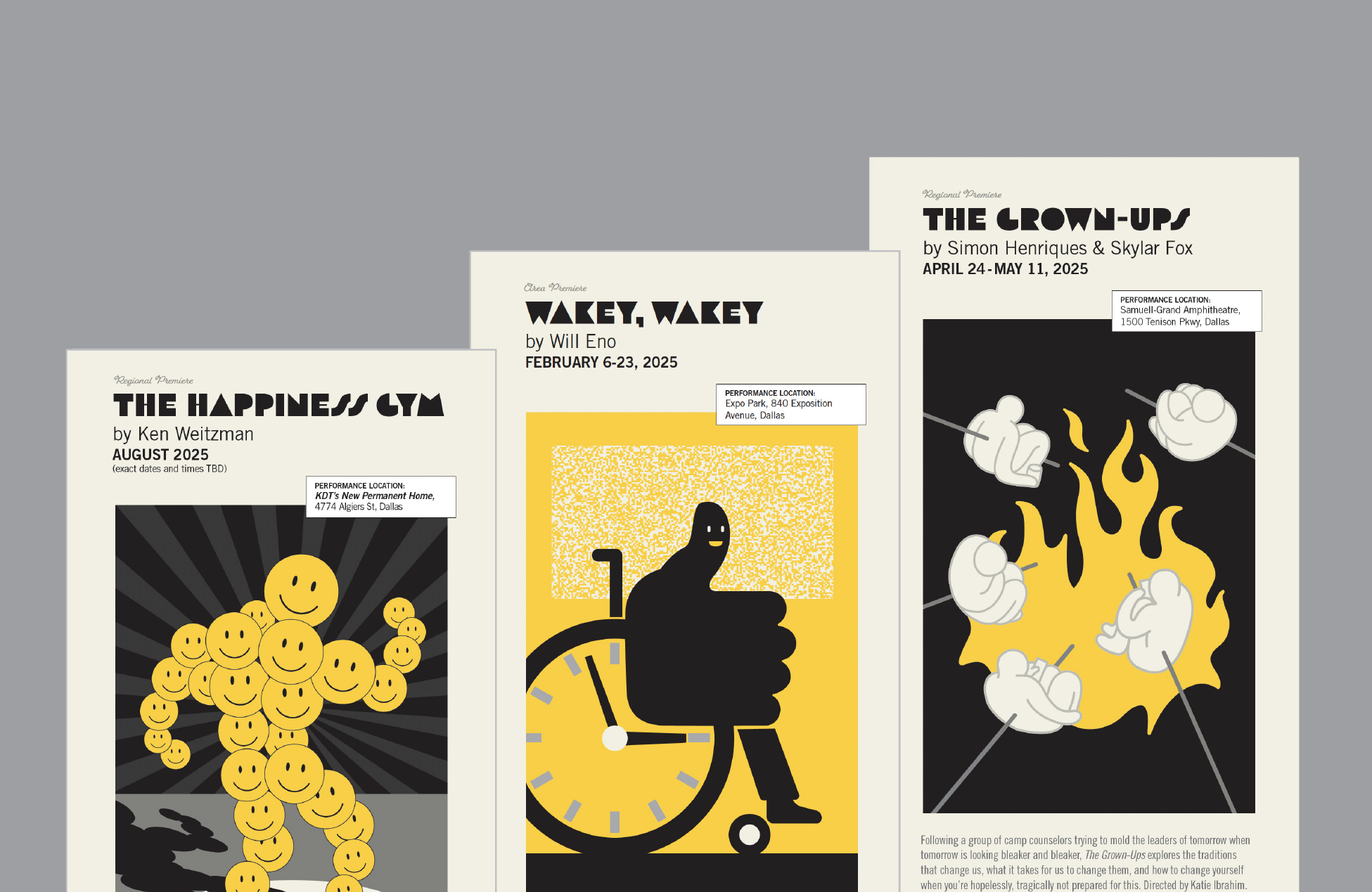 Holding down the #3 spot (in alphabetical order), we draw open the curtains on a perennial favorite task that lets multiple designers step into the spotlight: the annual Kitchen Dog Theater season mailer/play posters job. Take a bow, Kelly Allen and Chuck Johnson!